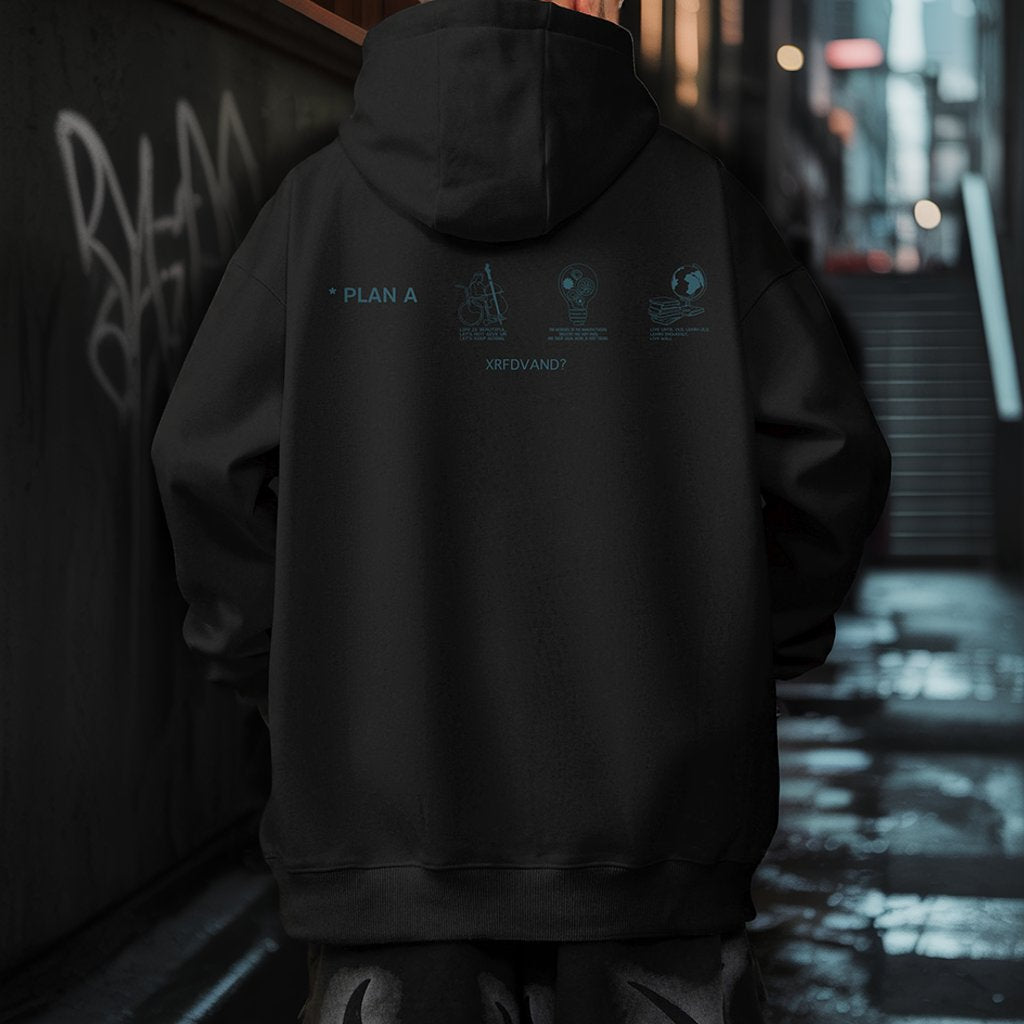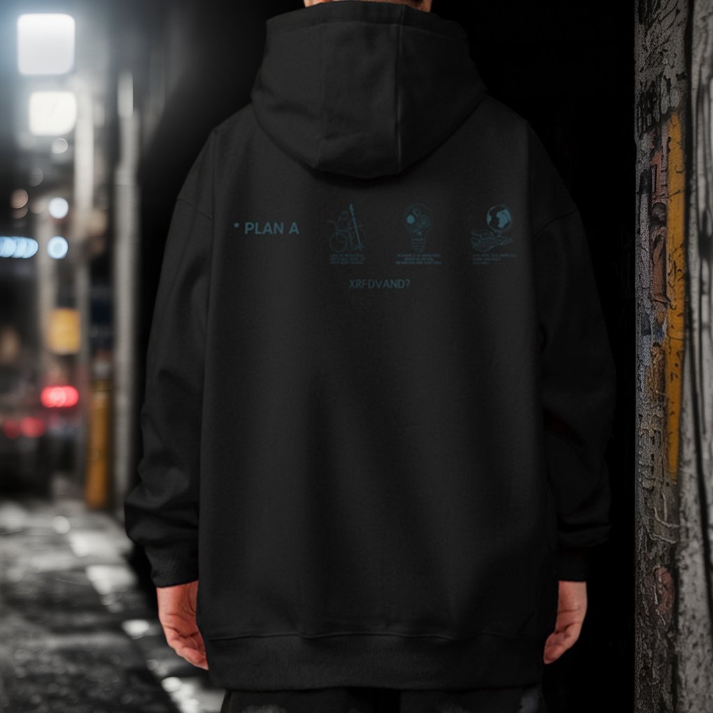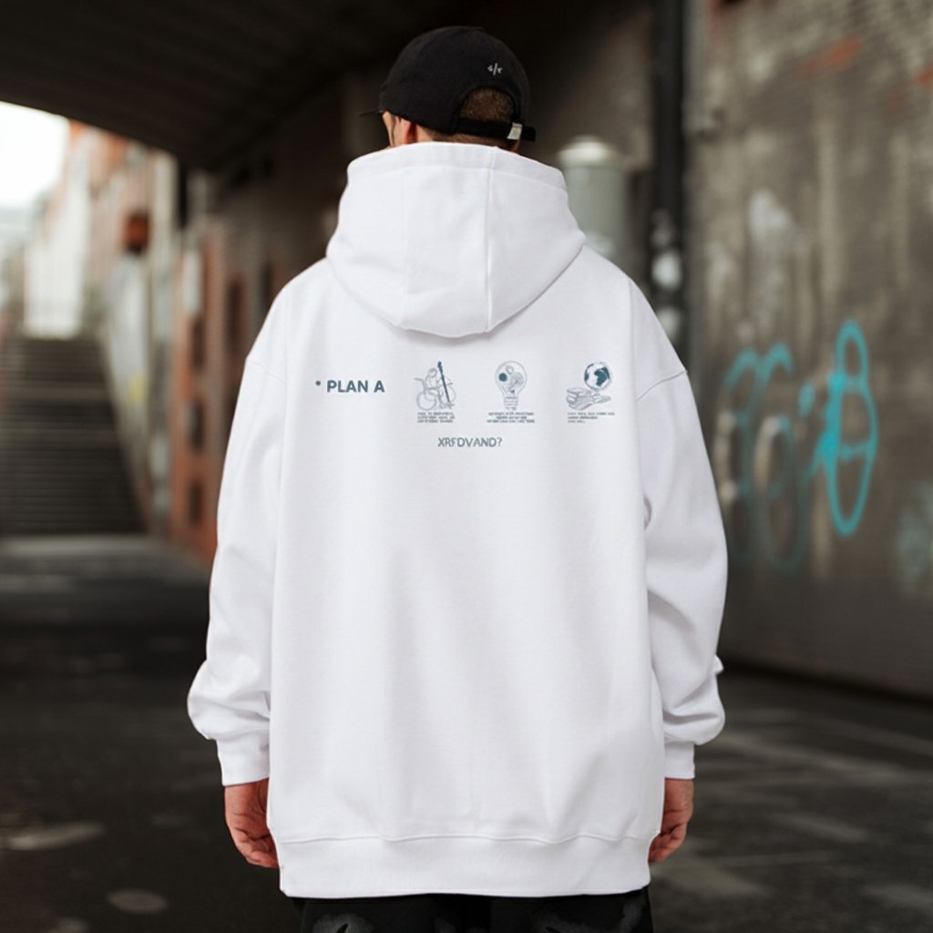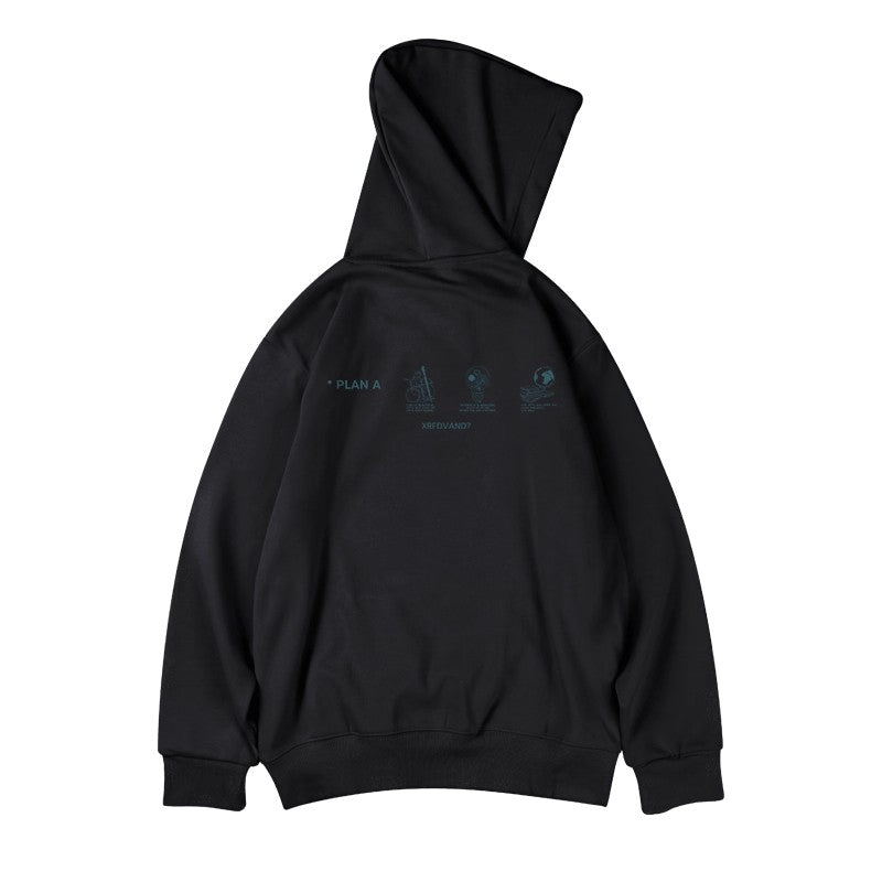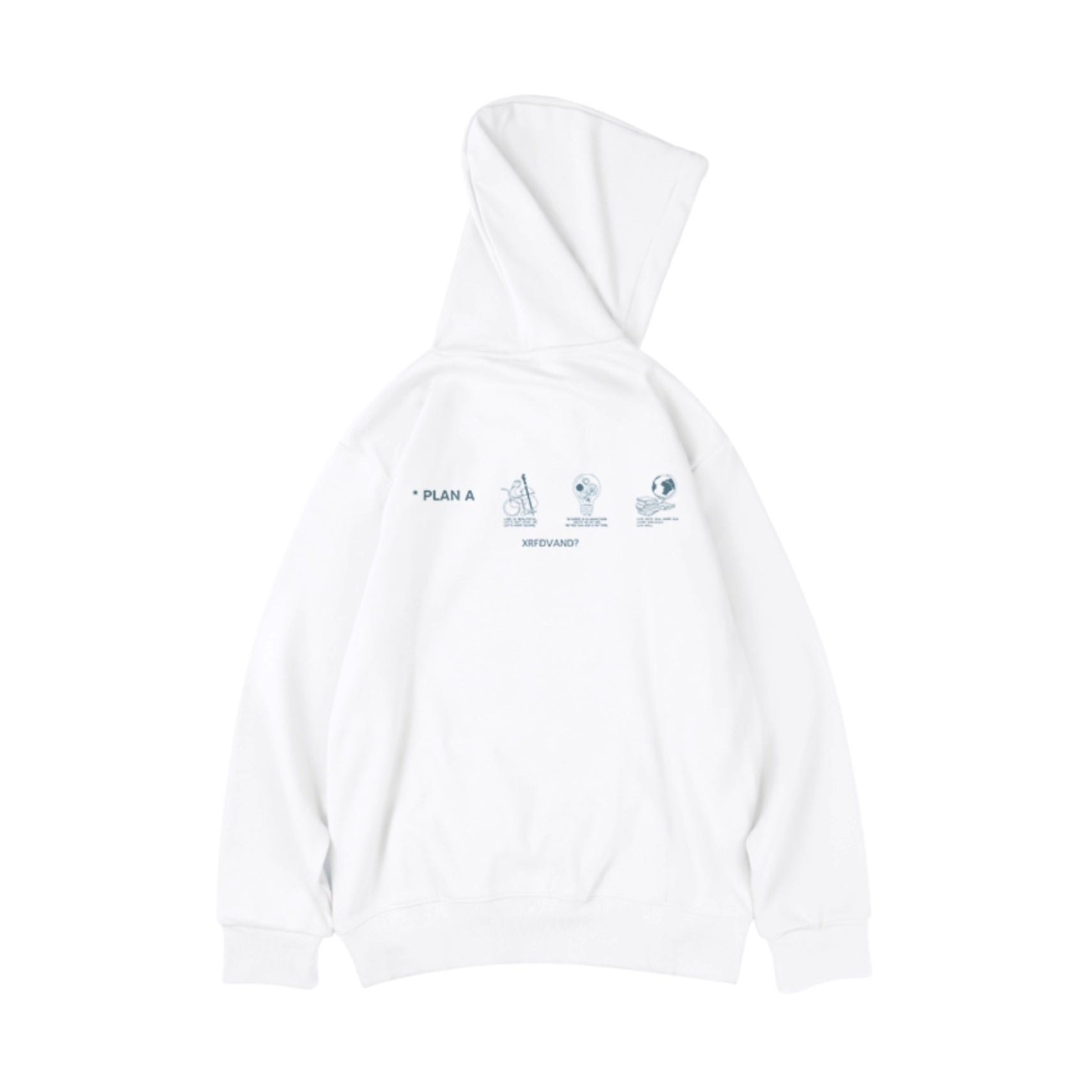 背面に「PLAN A」とアイコンモチーフを並べた、クリーンな印象のプルオーバーフーディ。
