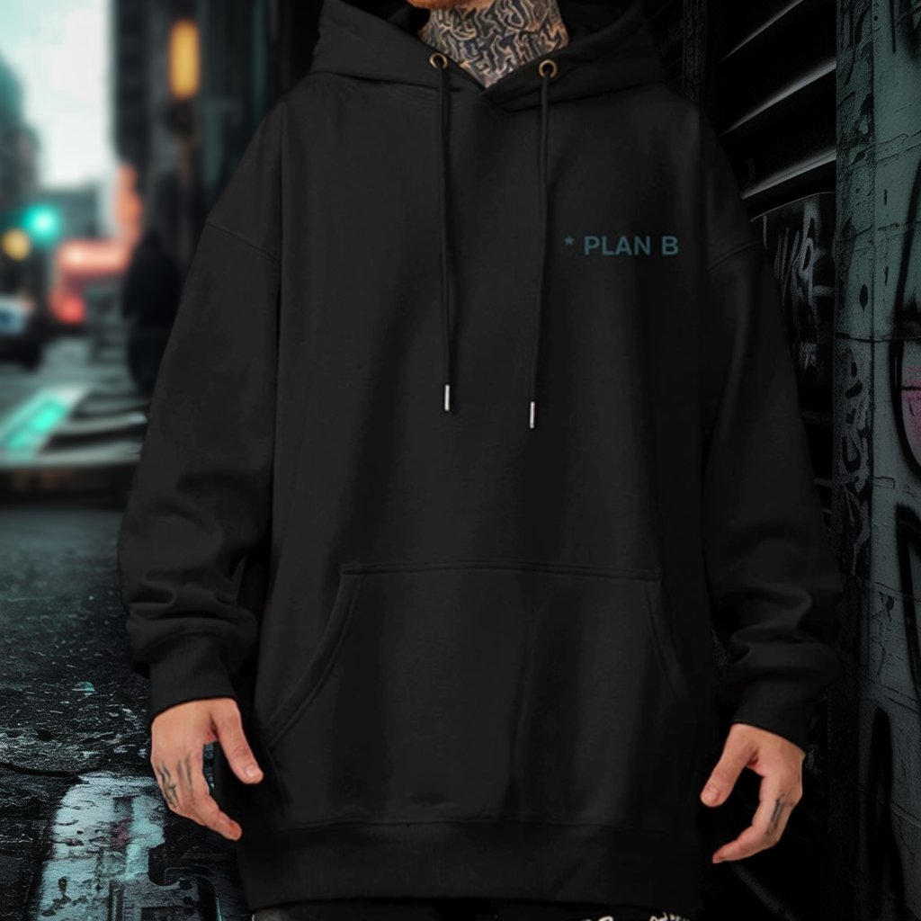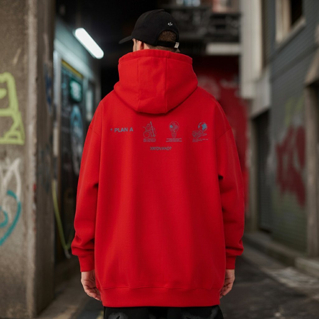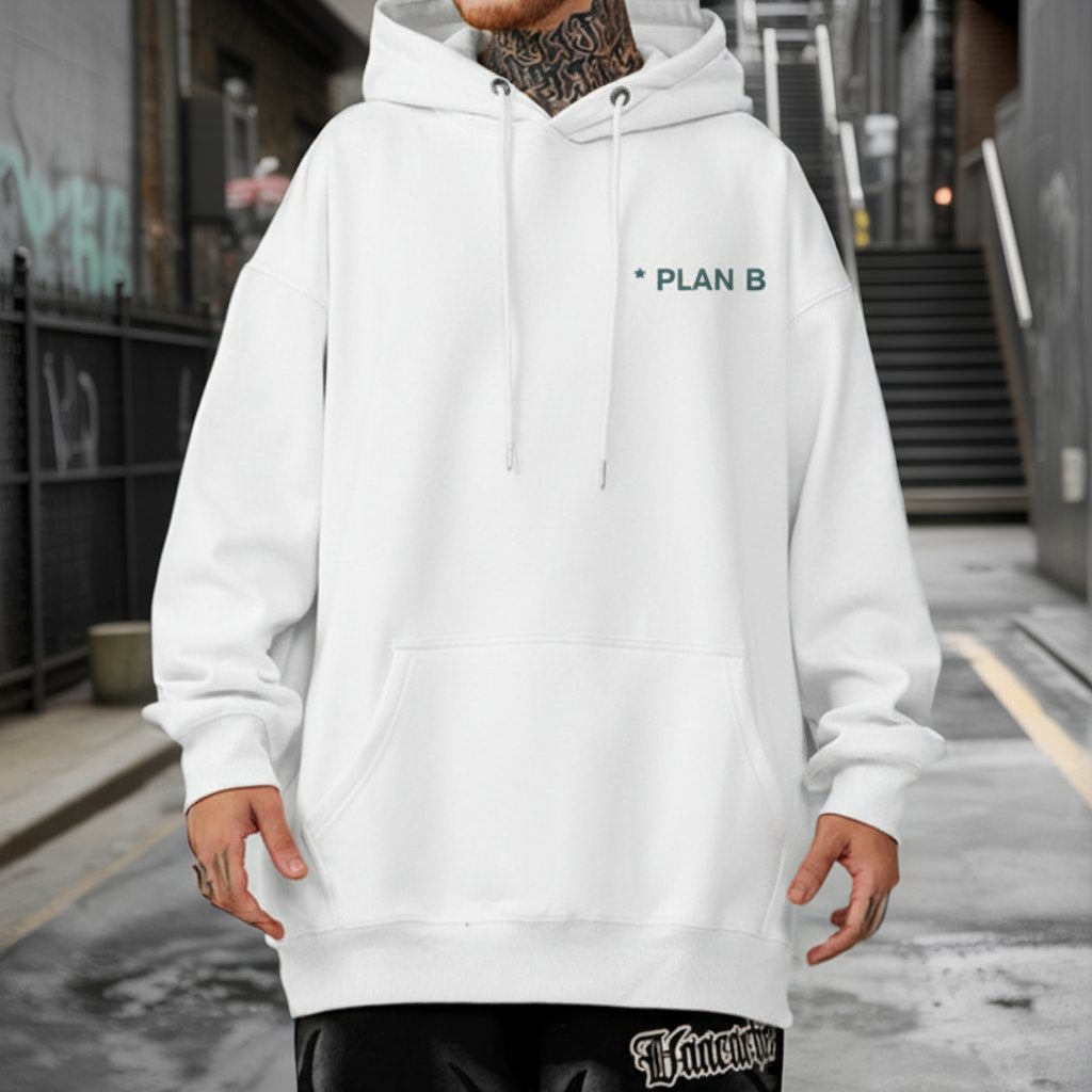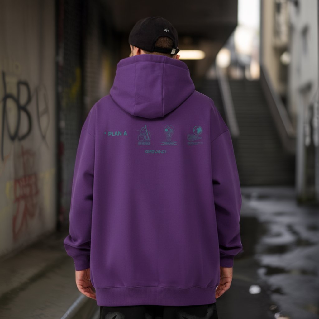 背面に「PLAN A」とアイコンモチーフを並べた、クリーンな印象のプルオーバーフーディ。