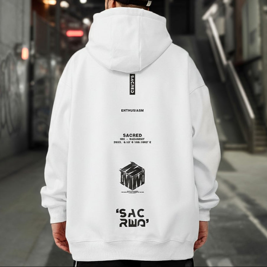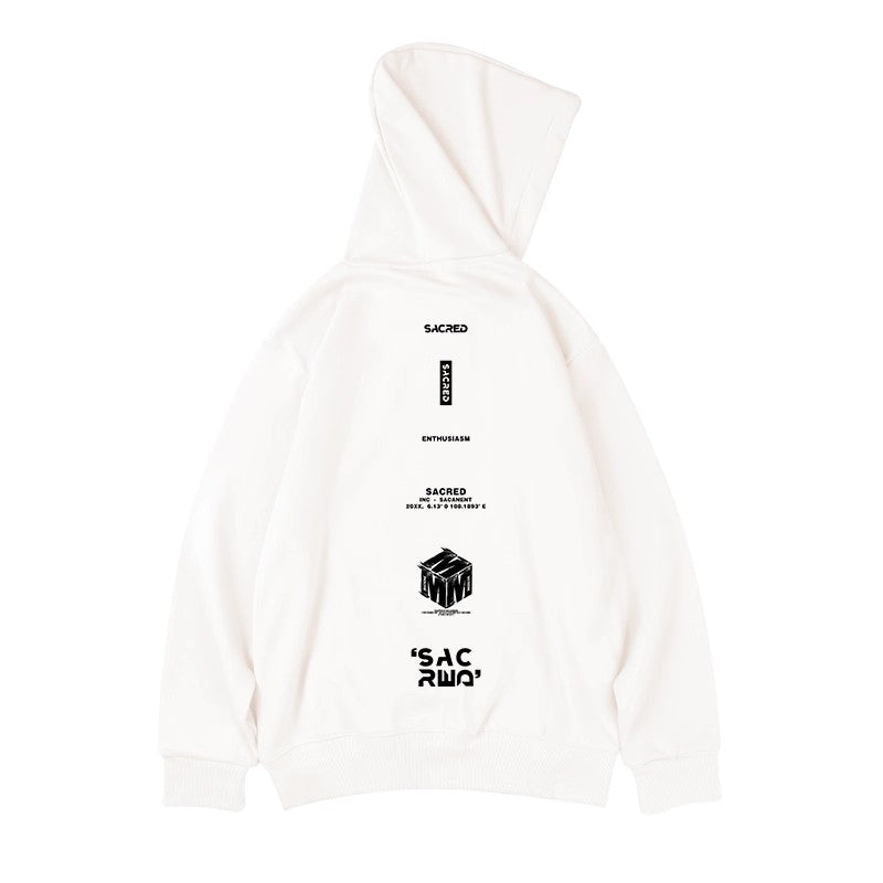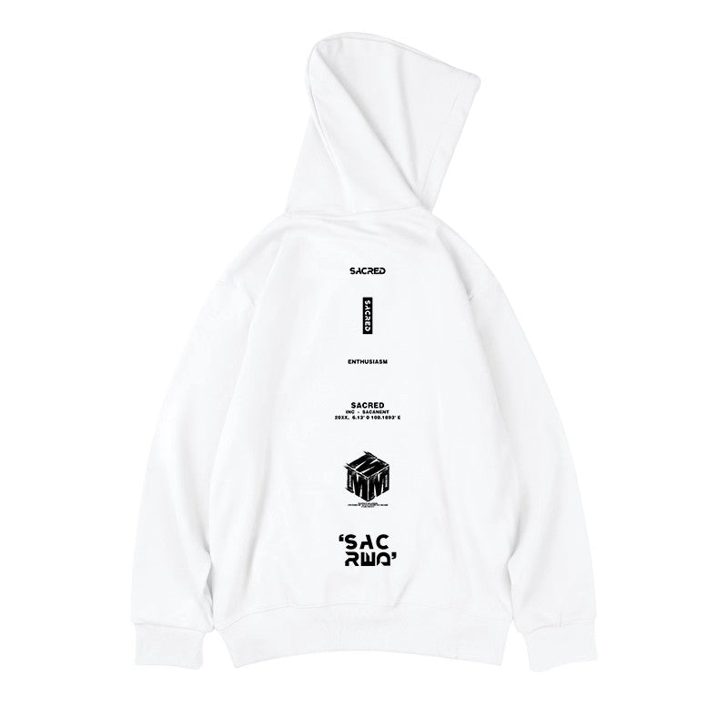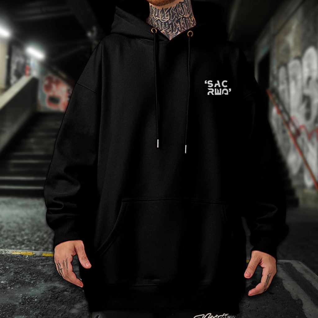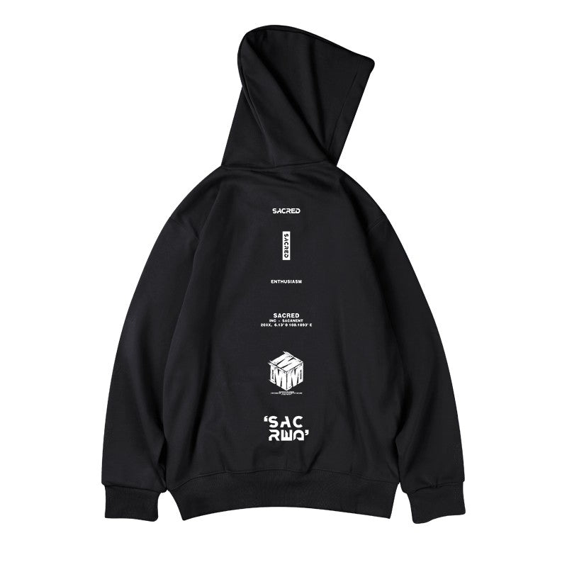背面に複数のロゴやテキストを縦にレイアウトした、静かな存在感を放つプルオーバーフーディ。