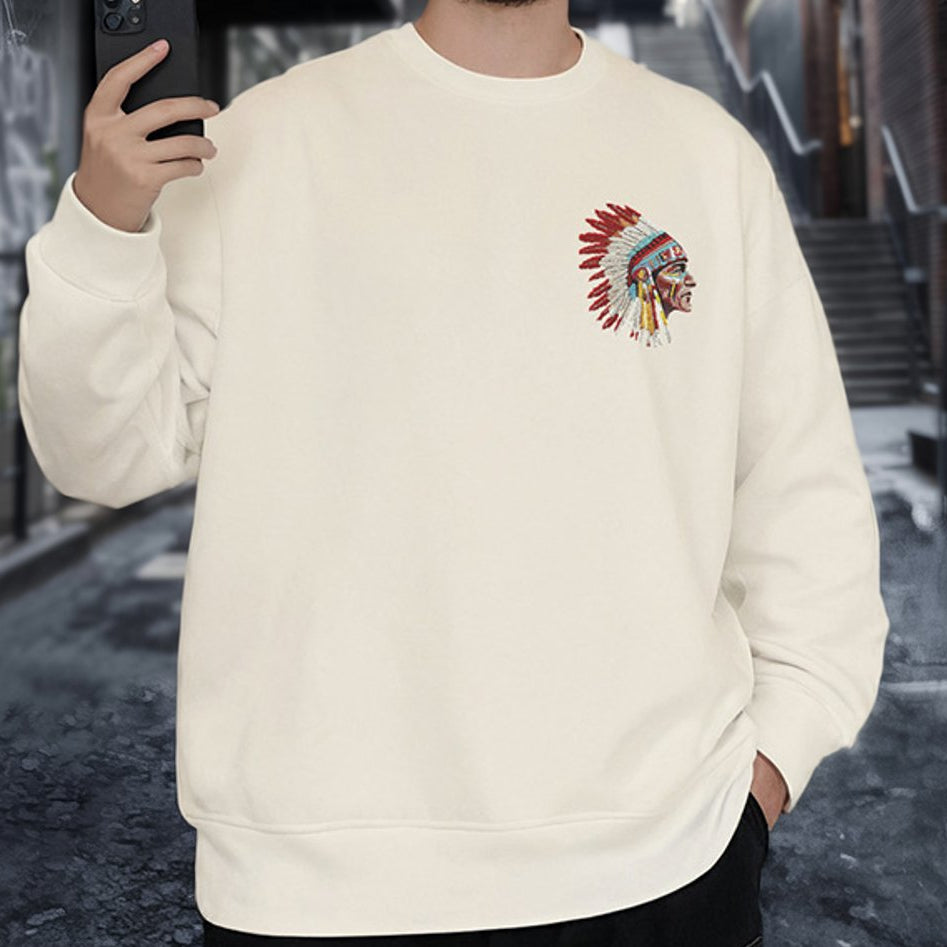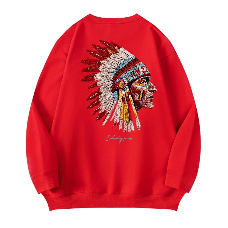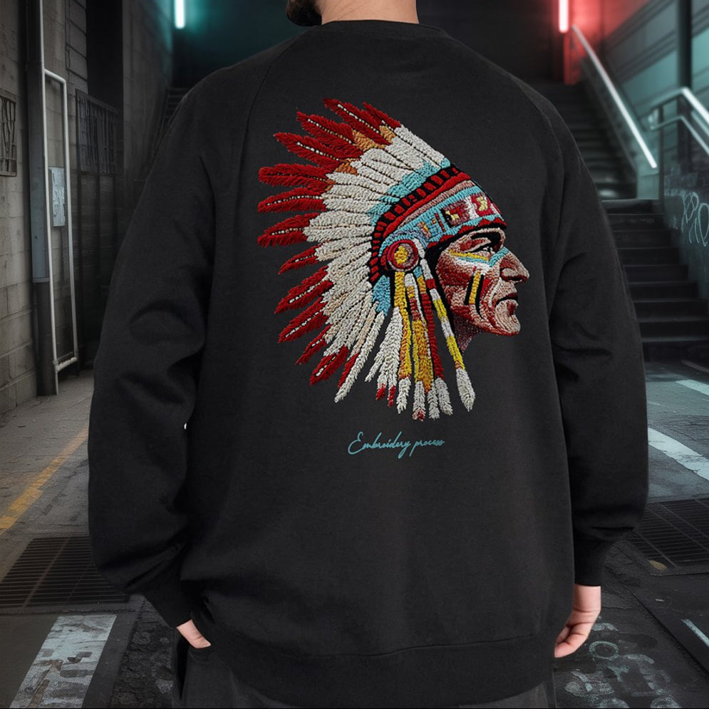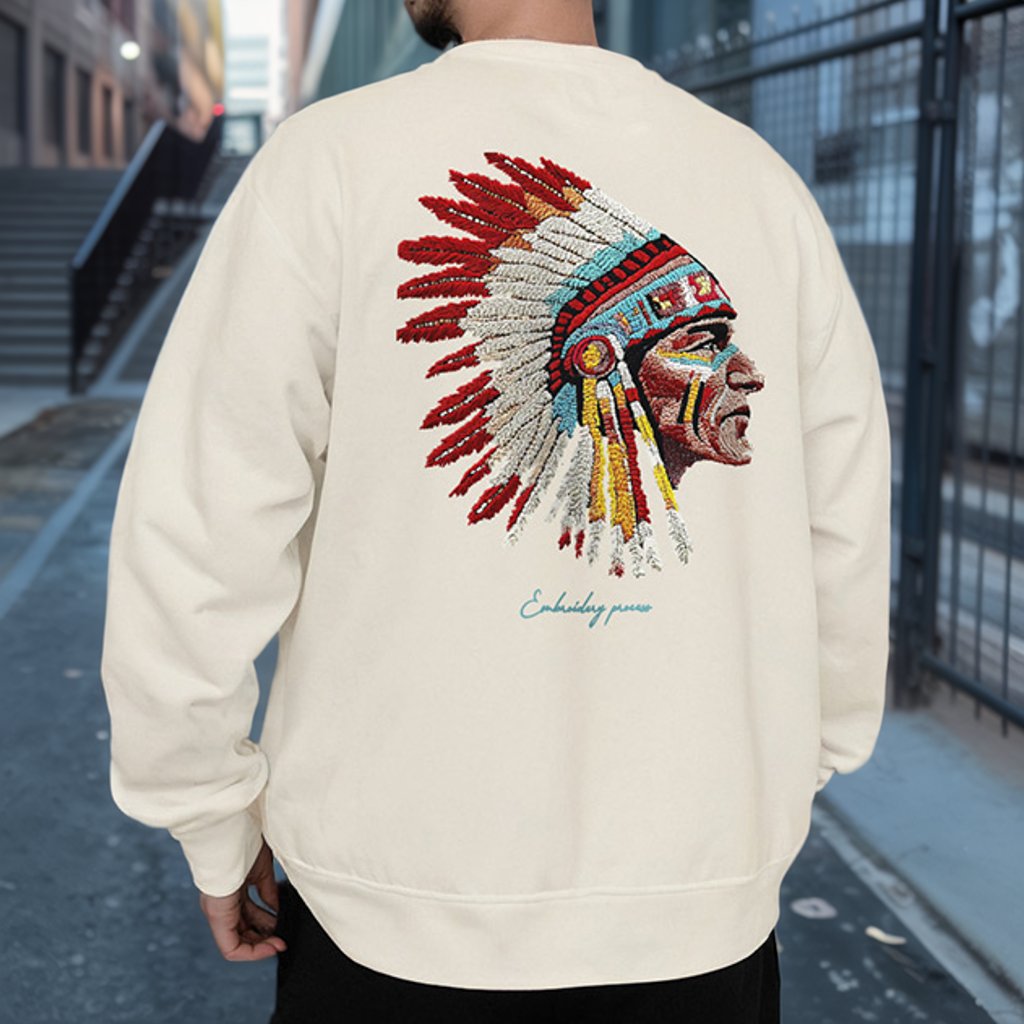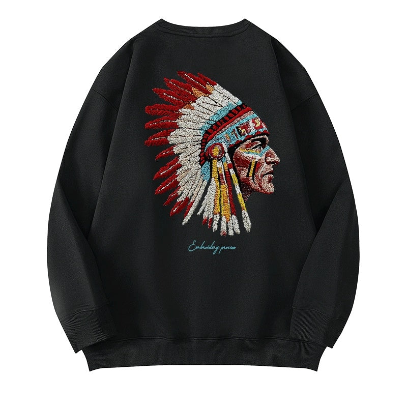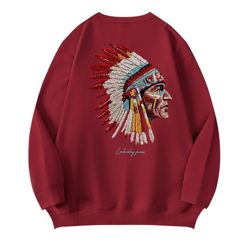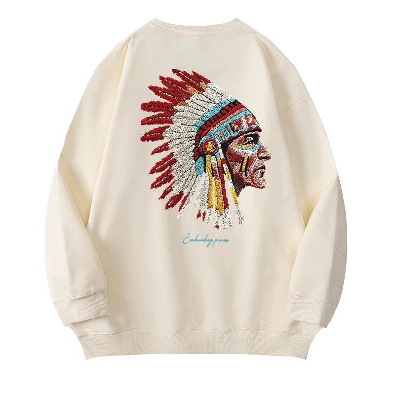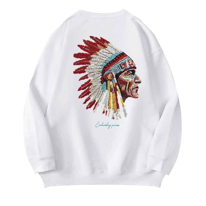 背面に羽飾りを付けた横顔モチーフを多色の刺繍で立体的に表現したスウェットです。