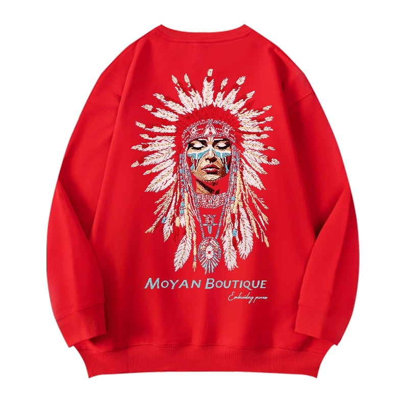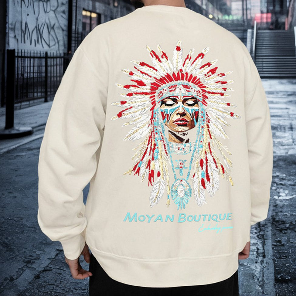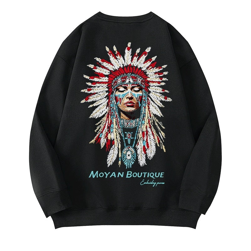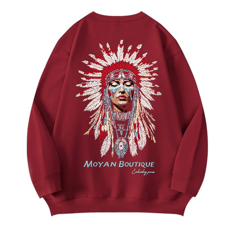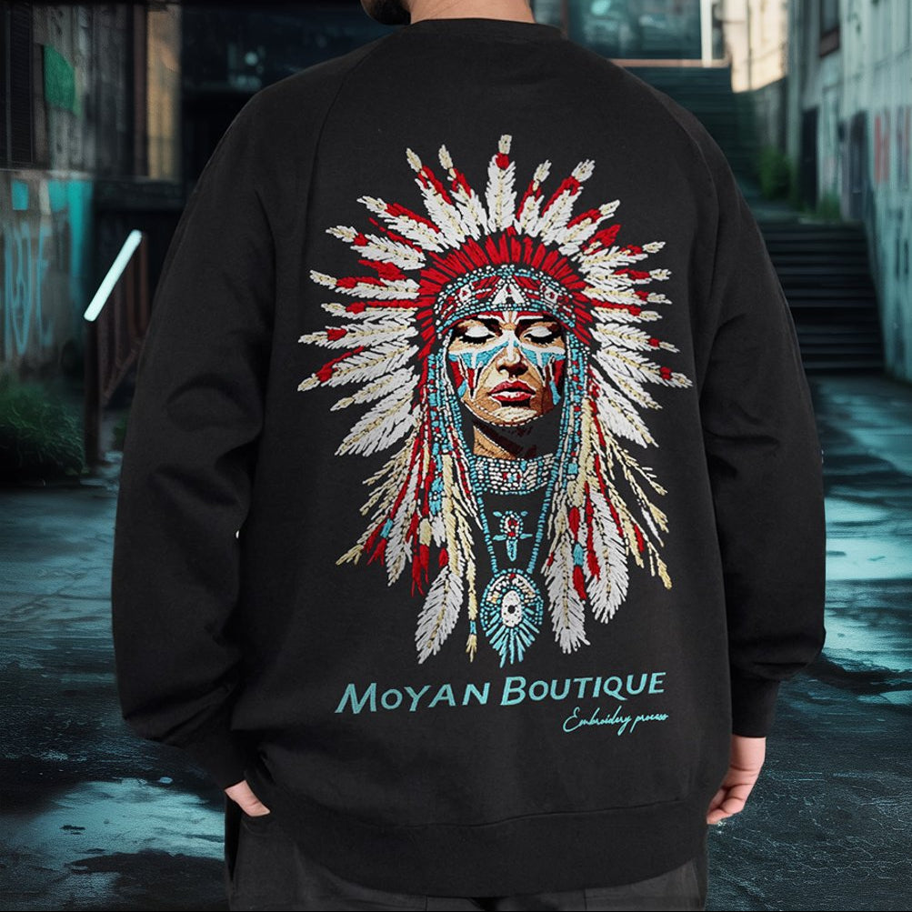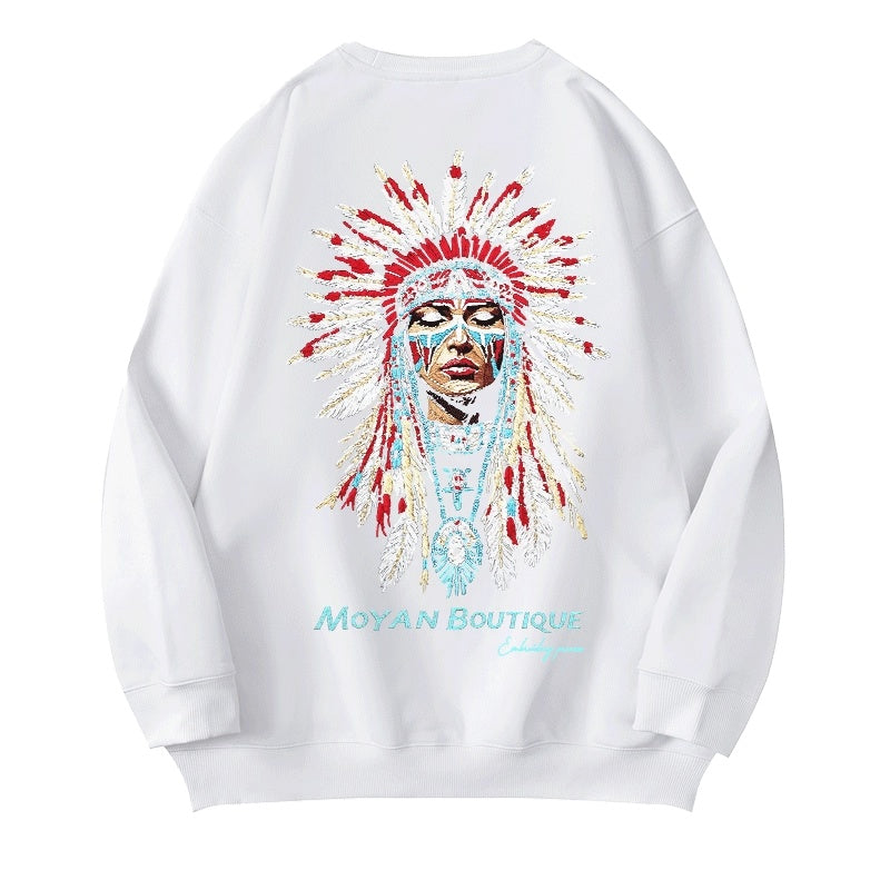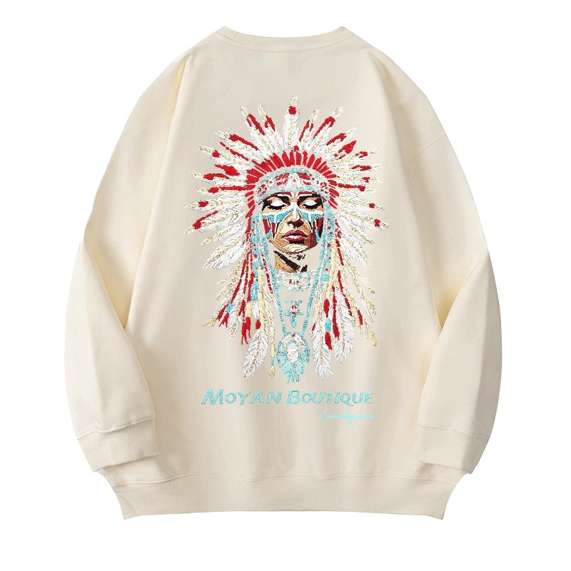 背面に多色の糸を重ねて立体的に仕上げた、羽飾りをまとった人物モチーフの大判刺繍が印象的なスウェットです。