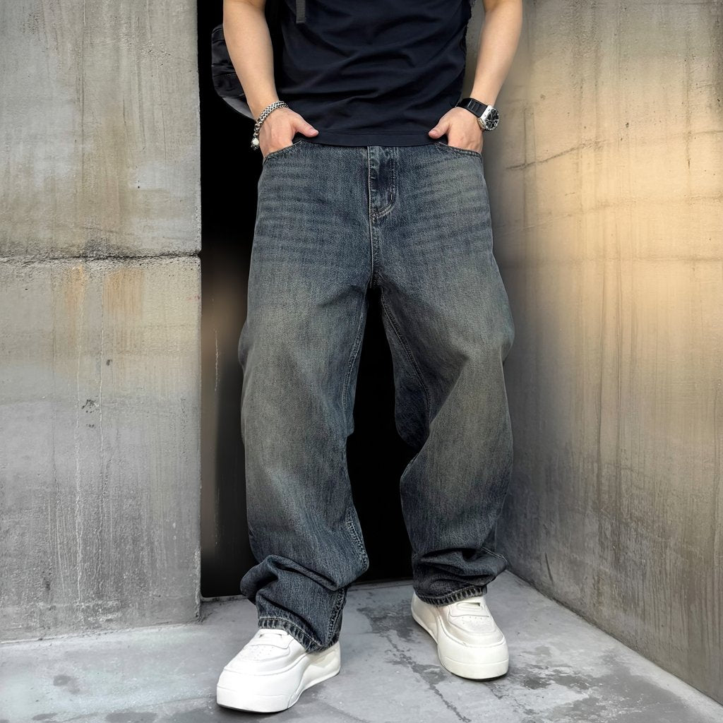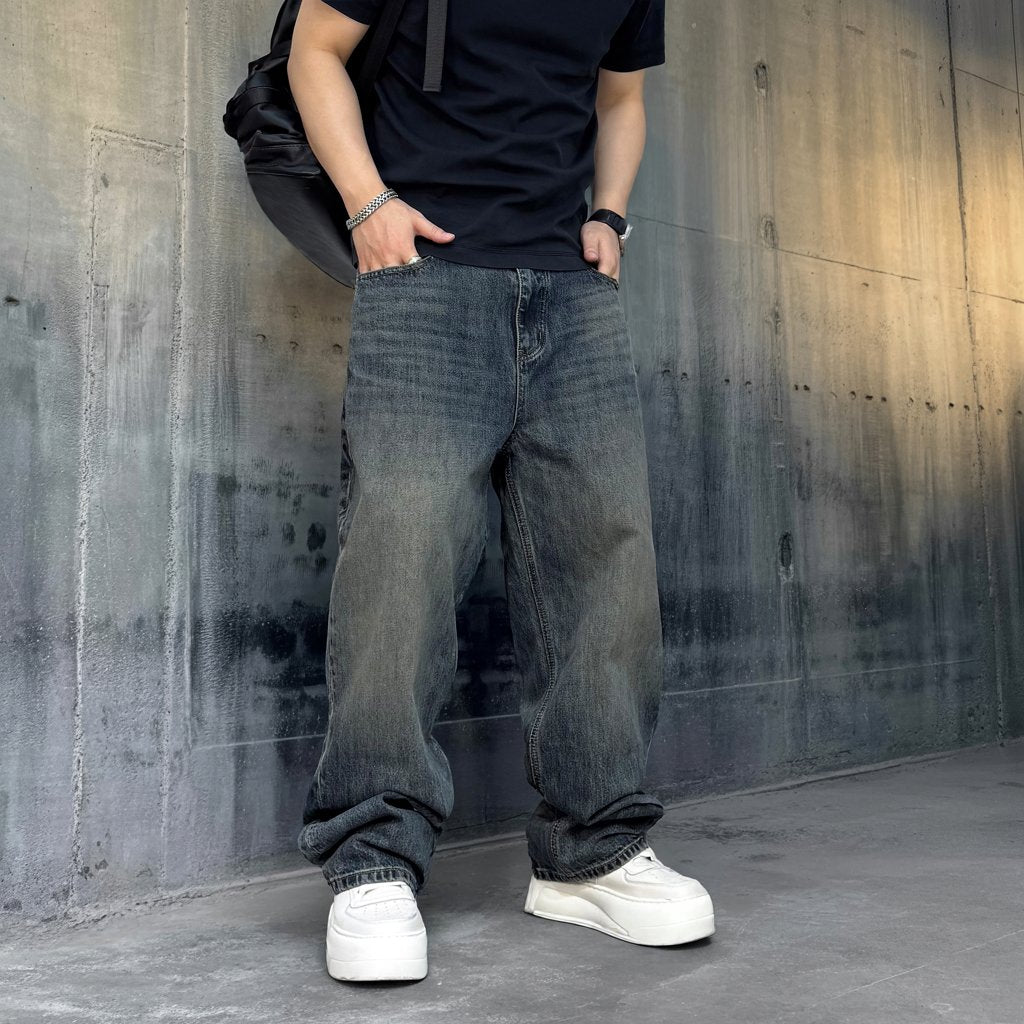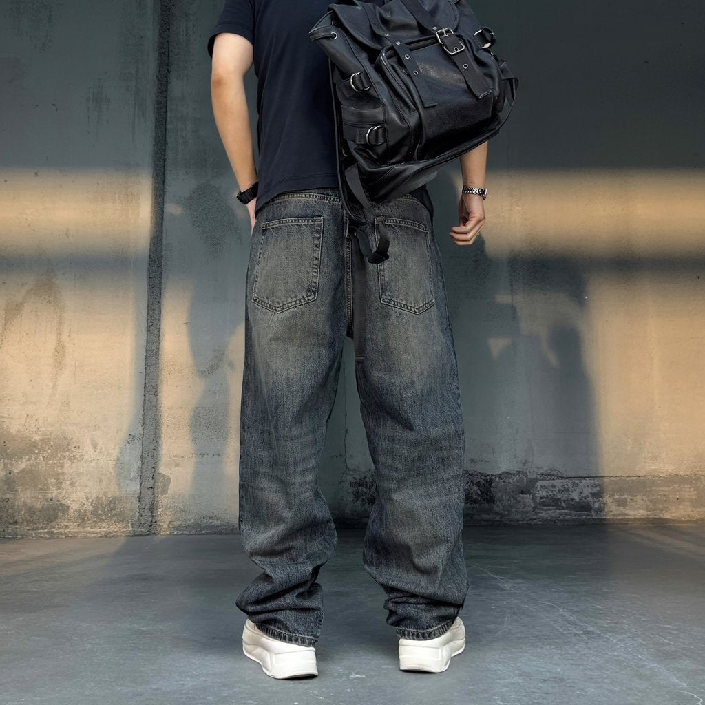 無骨なワイドシルエットに、深みのあるフェードウォッシュが映えるデニムパンツ。