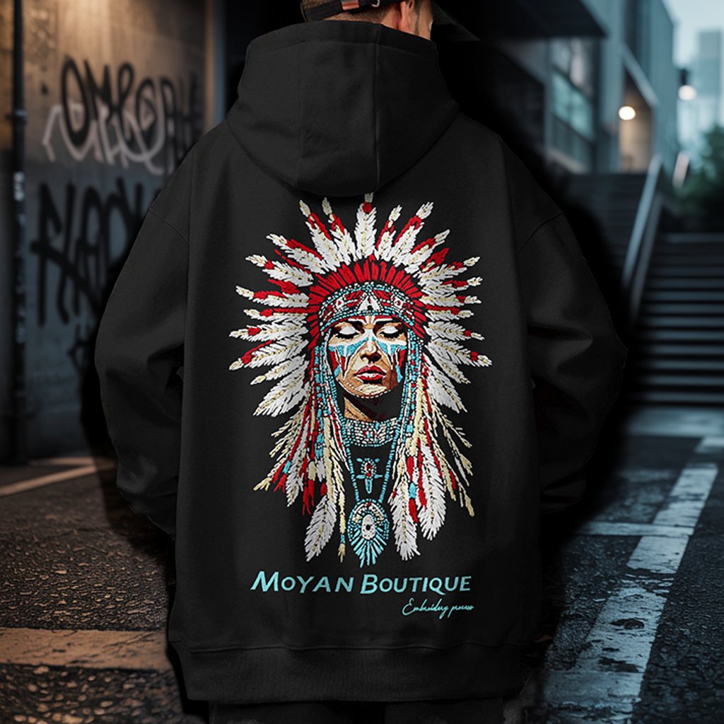 存在感を放つバックプリントに、羽根飾りを纏った象徴的なグラフィック。