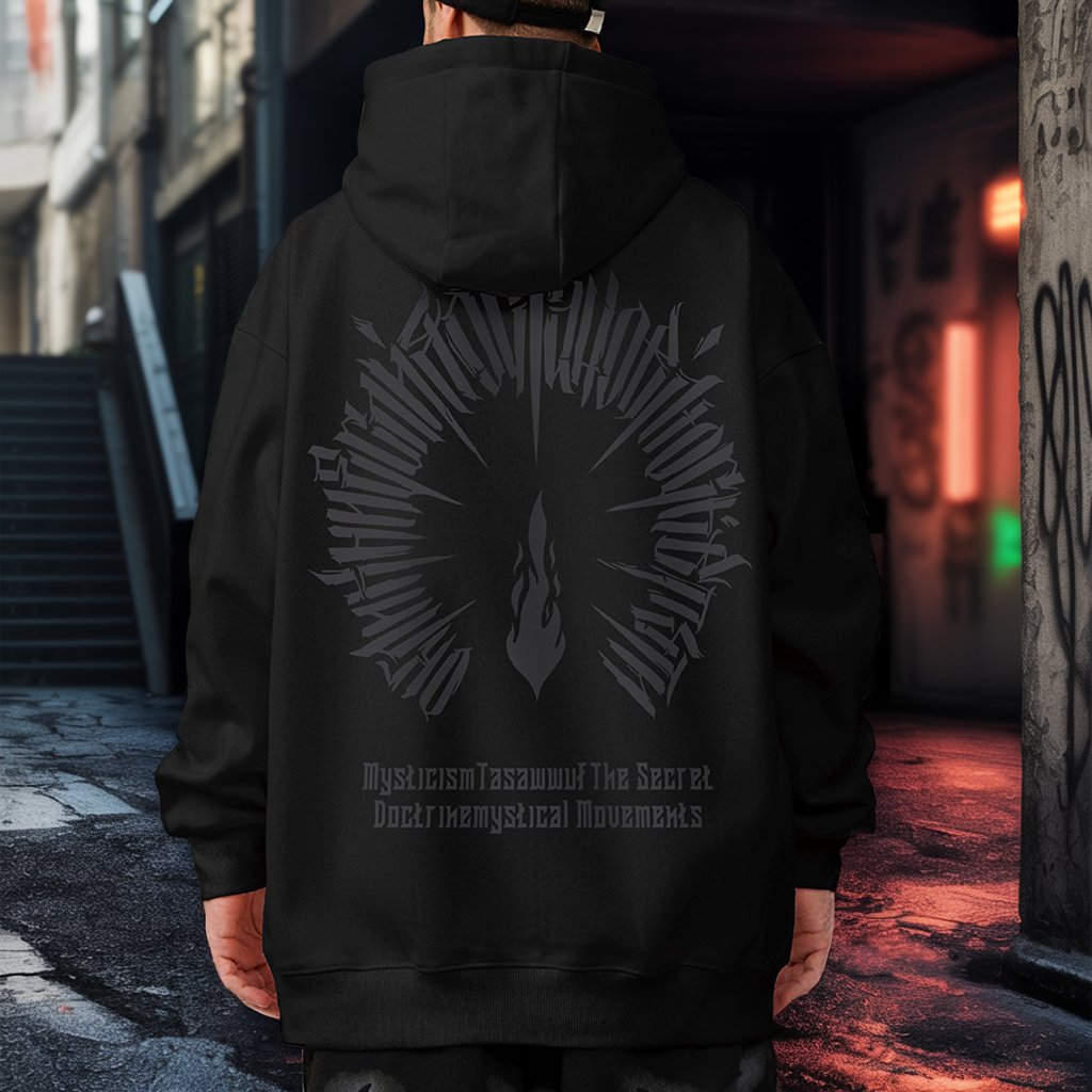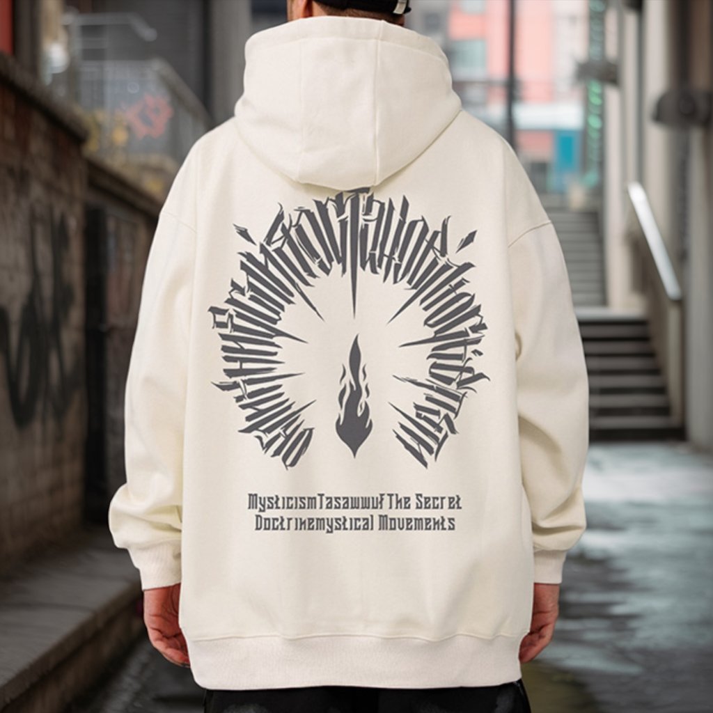 オーバーサイズのシルエットに、バックへ放射状に広がるテキストグラフィック。