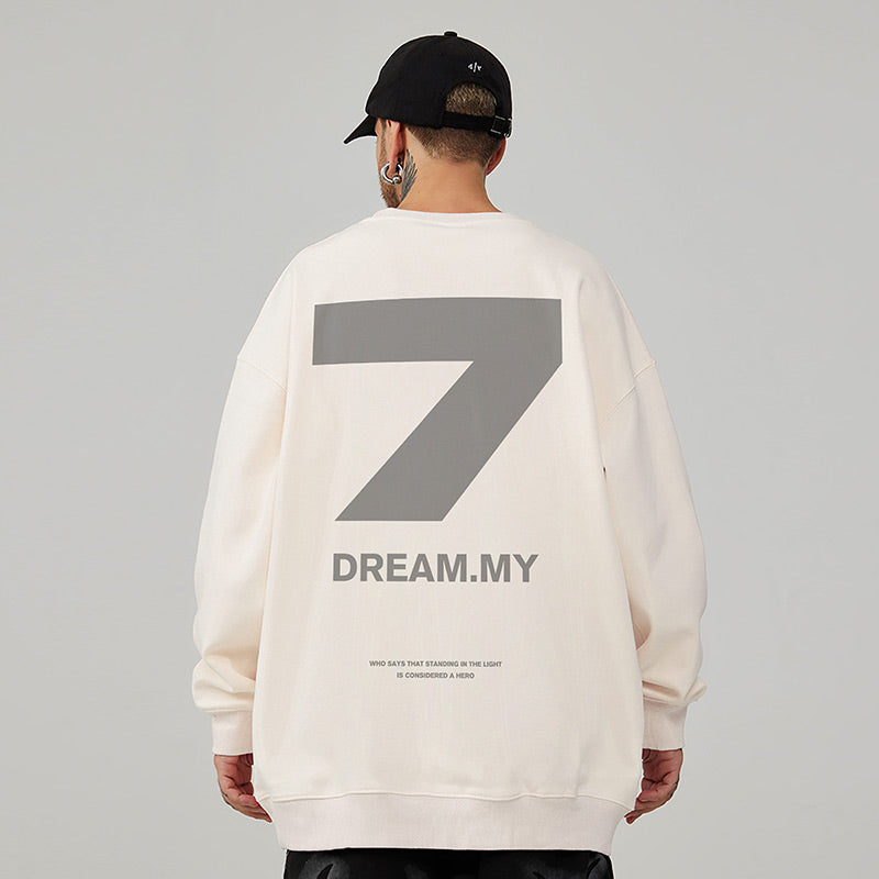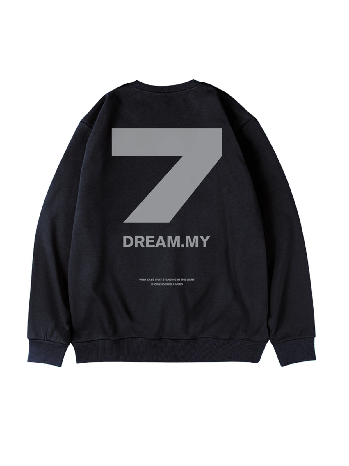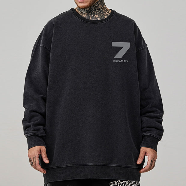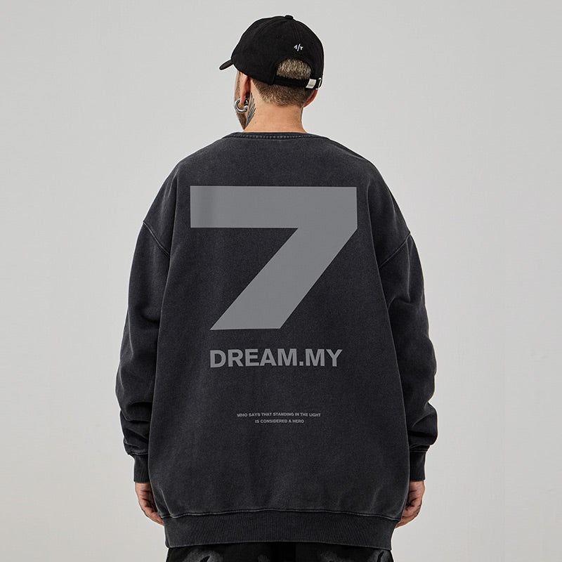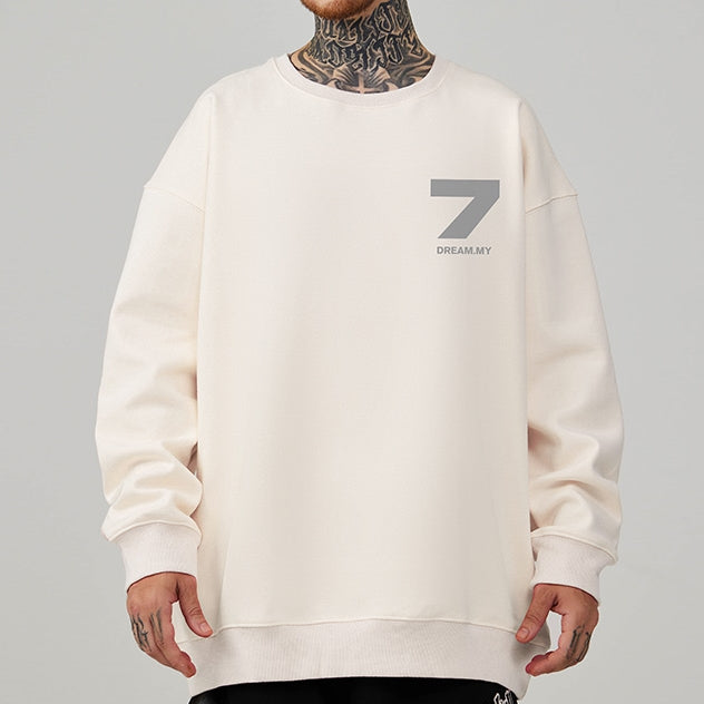 背面に大胆な「7」とメッセージを配した、存在感あるグラフィックスウェット。