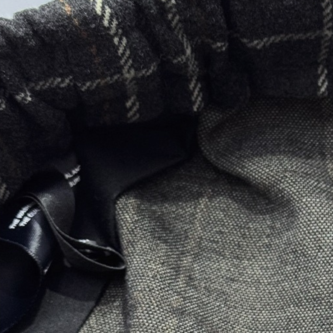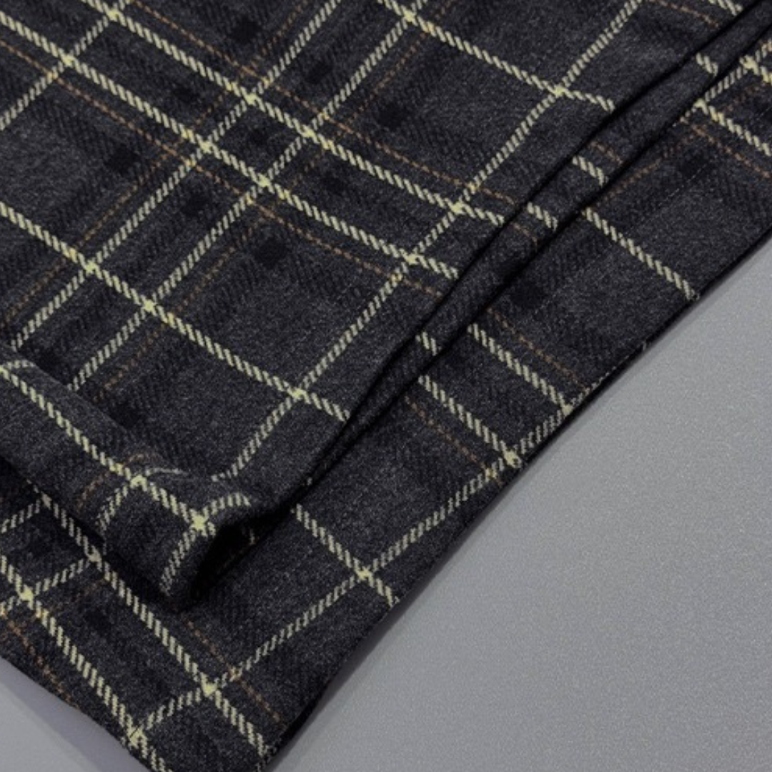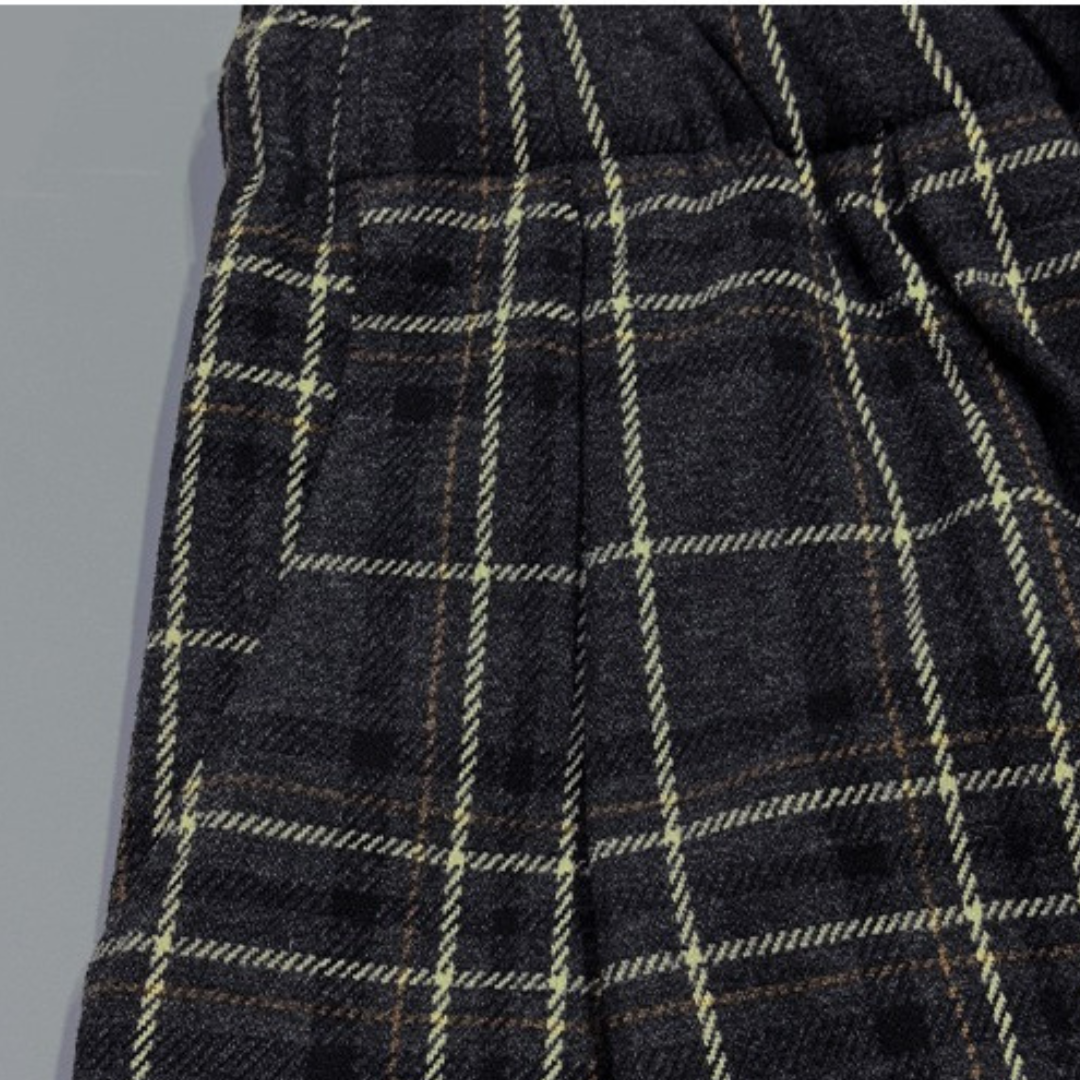 ゆったりとしたワイドシルエットに、トラッドなチェック柄を組み合わせたデザイン。