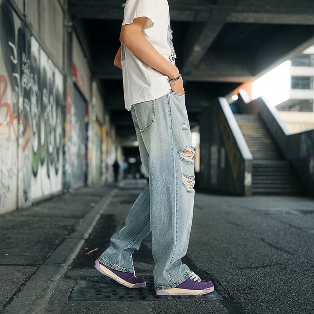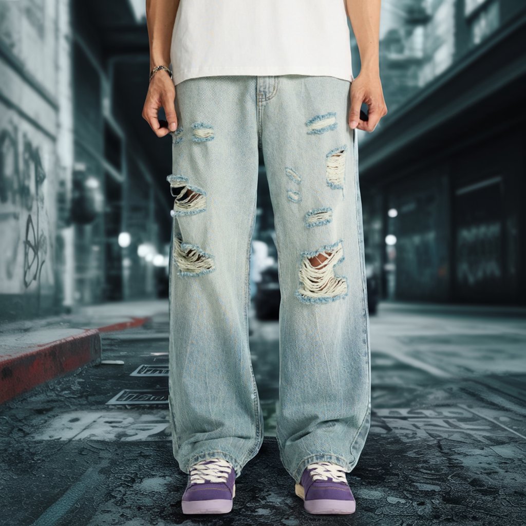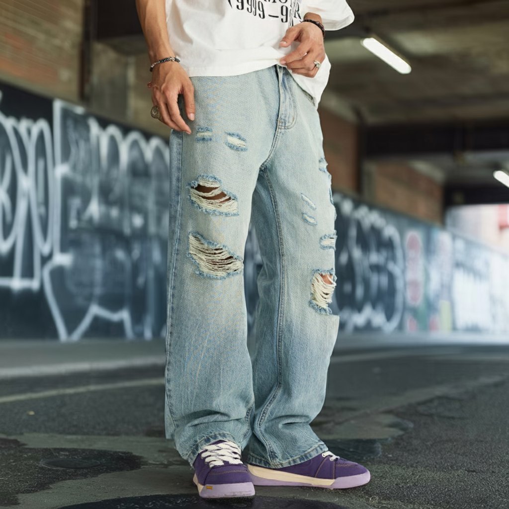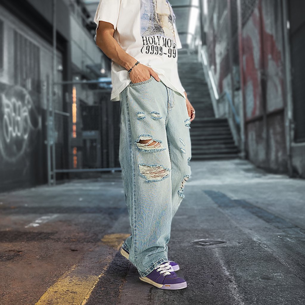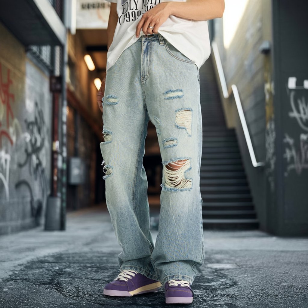 大胆なダメージ加工が目を惹く、ストリートライクなルーズフィットデニム。