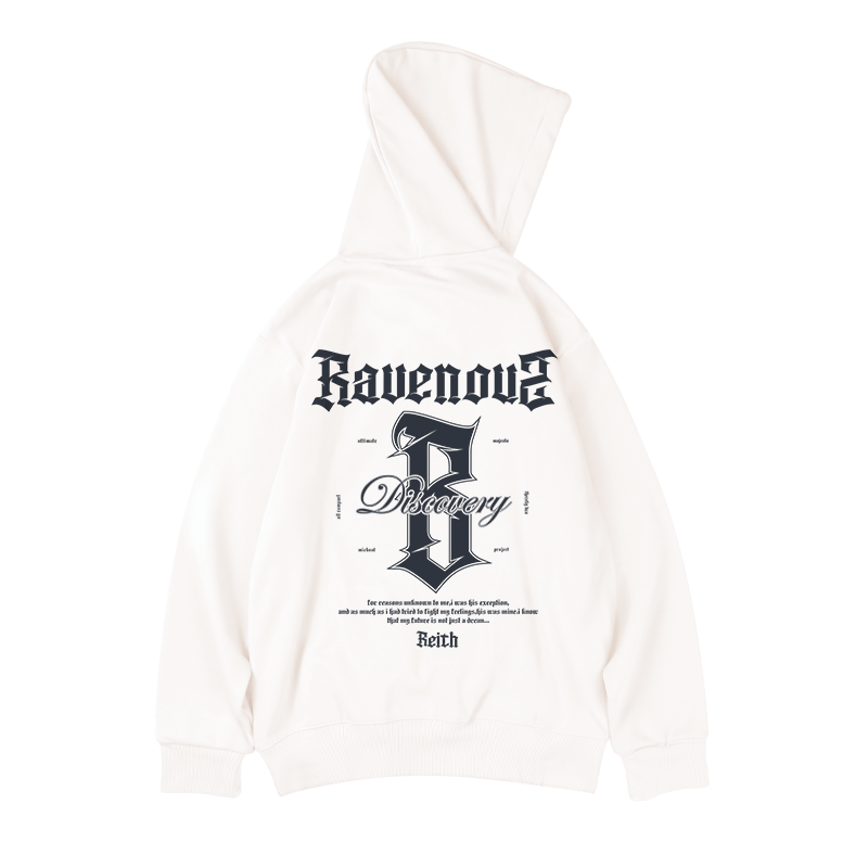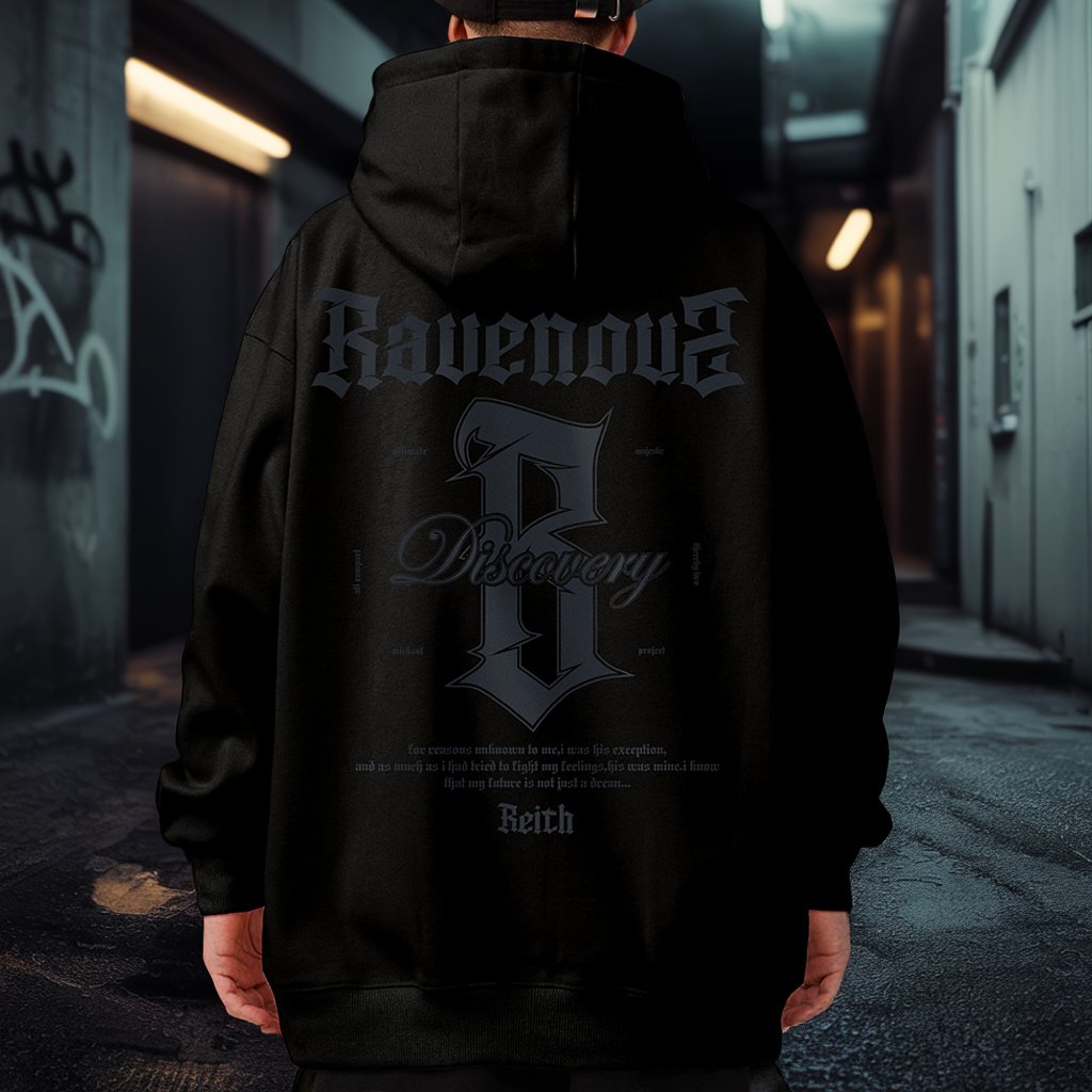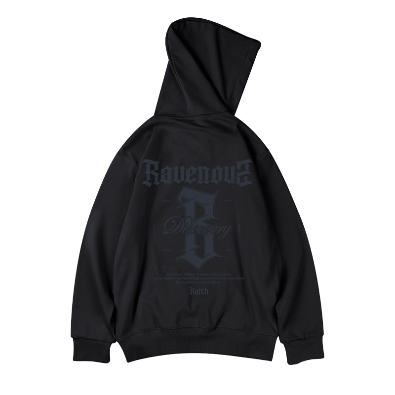 胸元の小さなロゴと、背面に大胆に配置したゴシックグラフィックが印象的。