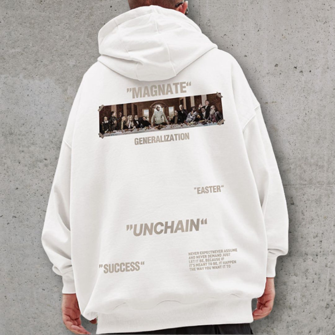 背面に横長フォトビジュアルと英字テキストを配置した、印象的なバックプリントパーカー。