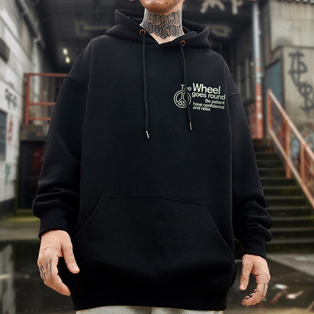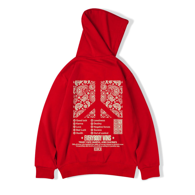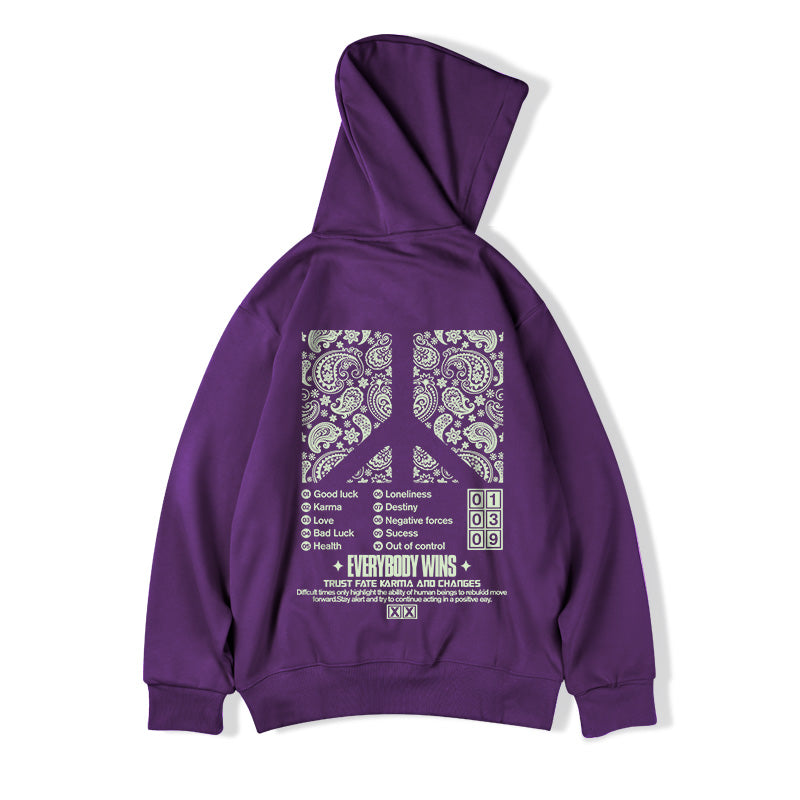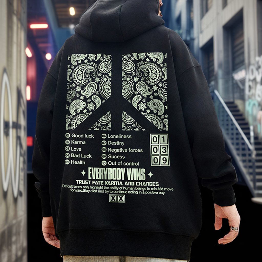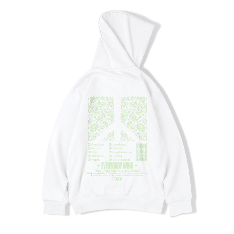 背面にピースマークとペイズリーを組み合わせた印象的なグラフィックが映えるパーカー。