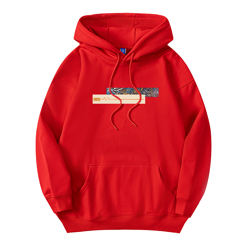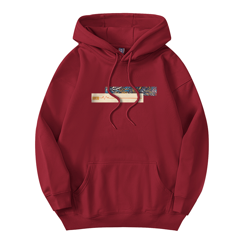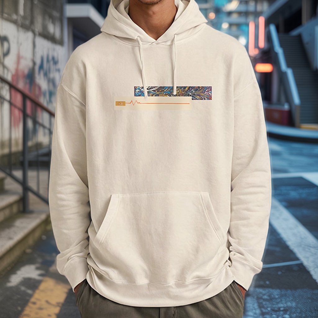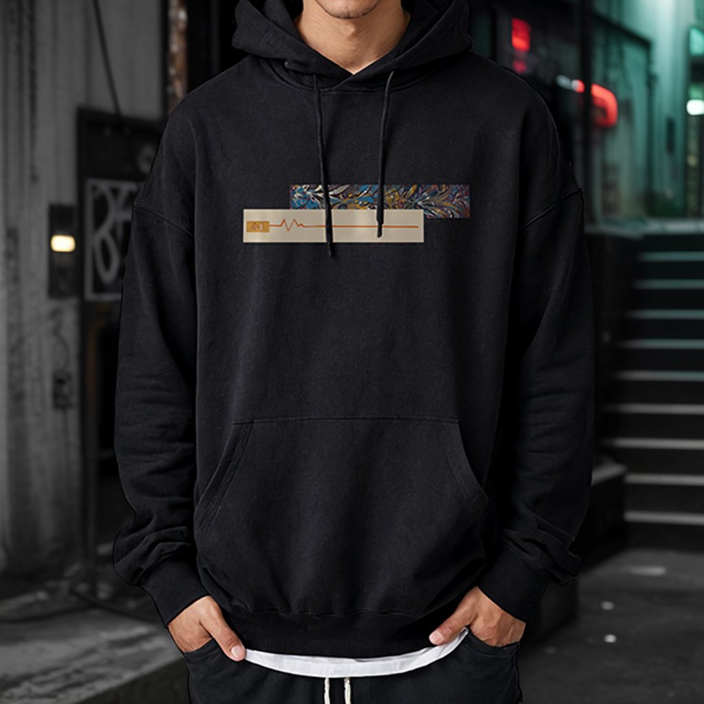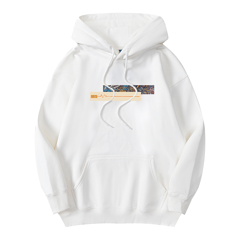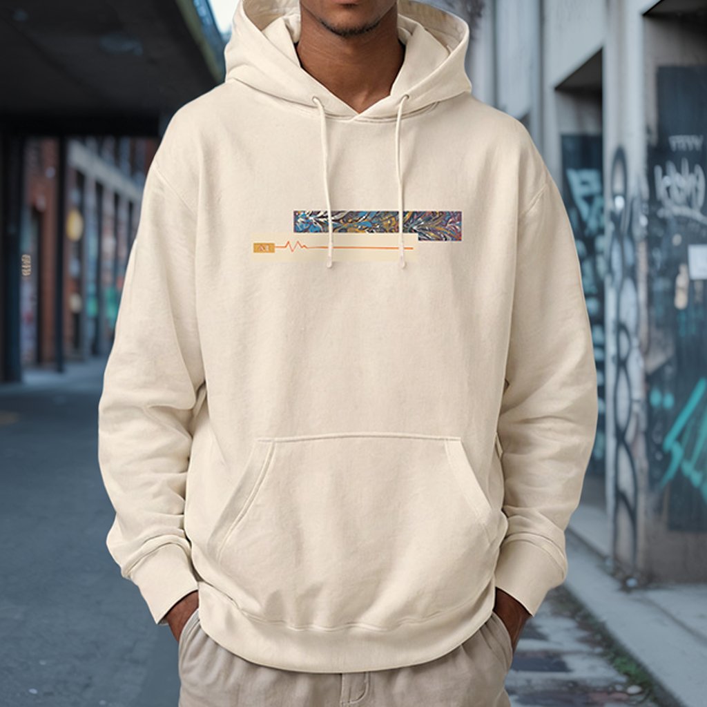 胸元に配置したアートバーが印象的な、ミニマルデザインのフーディー。