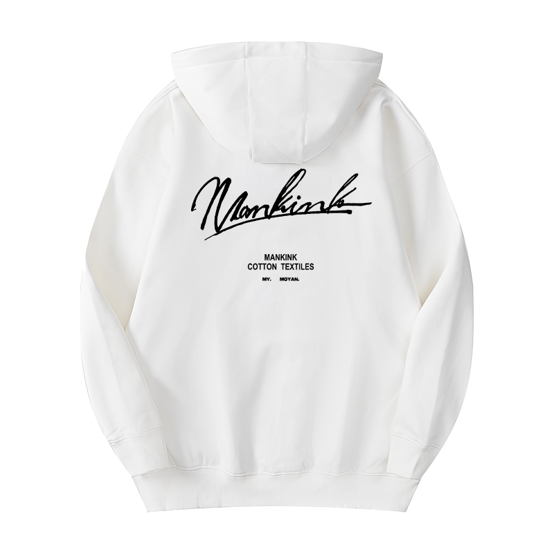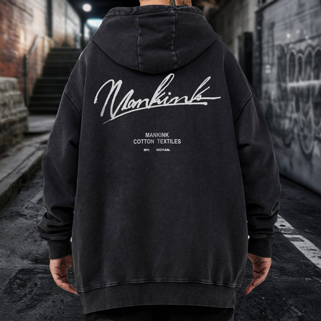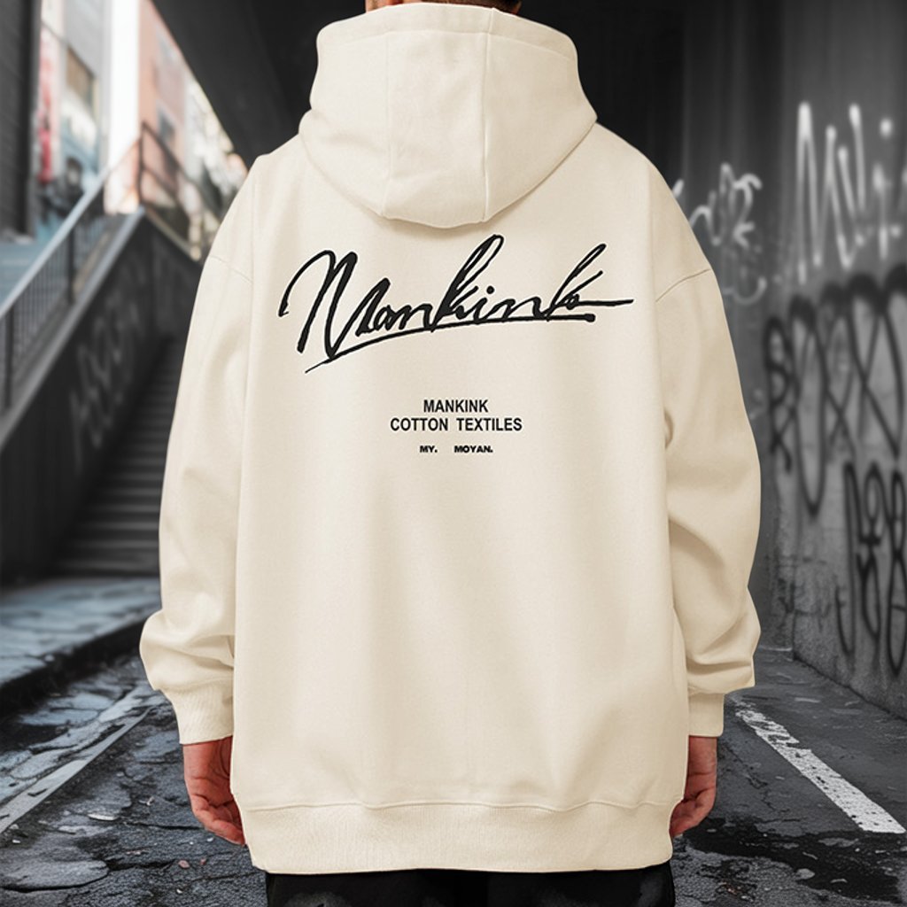 背面に流れるようなスクリプトロゴを配した、存在感のあるグラフィックパーカー。