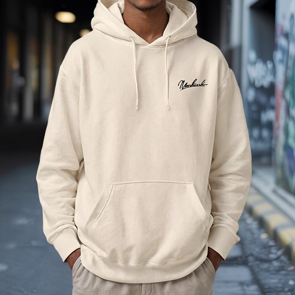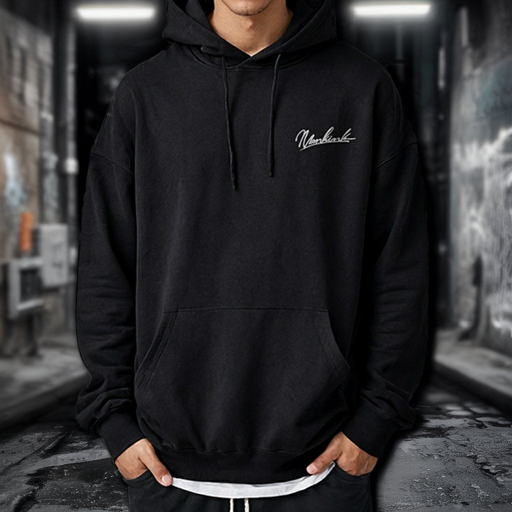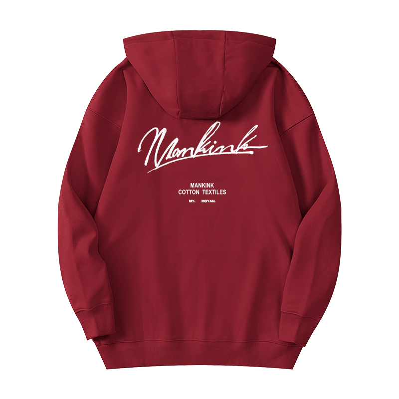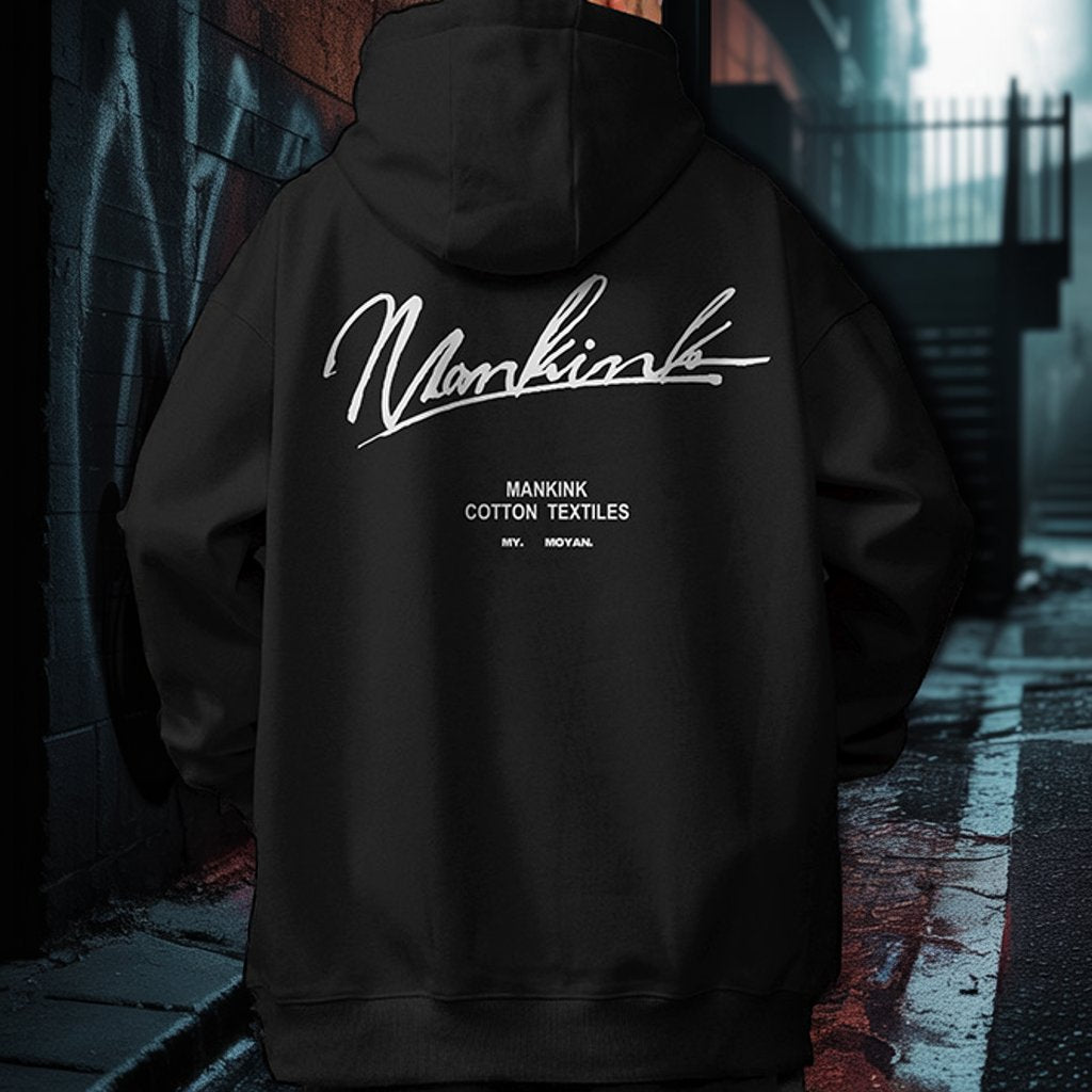 背面に流れるようなスクリプトロゴを配した、存在感のあるグラフィックパーカー。