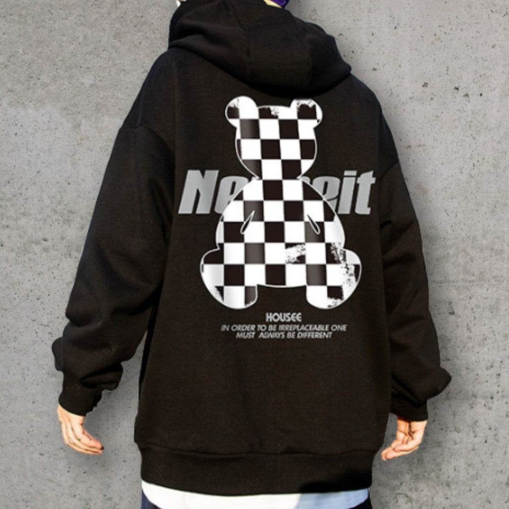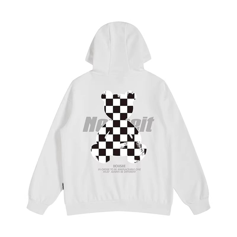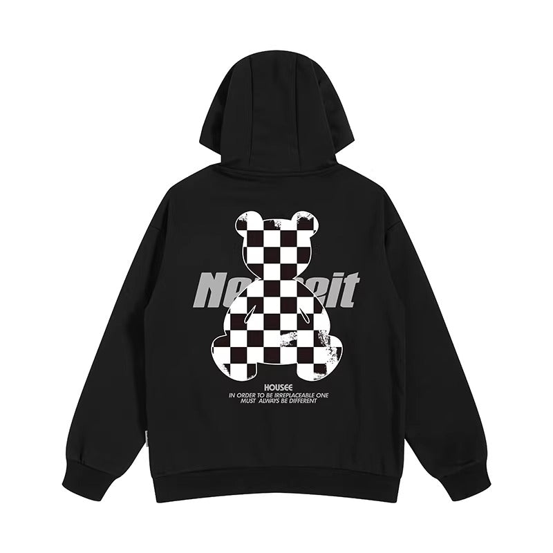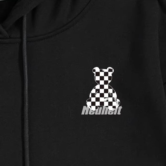 背面にチェッカーパターンのベアモチーフを大胆に配置した、ゆとりのあるシルエットのパーカー。