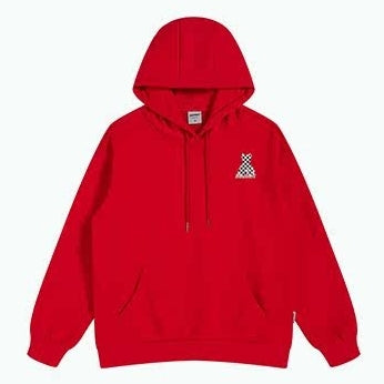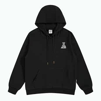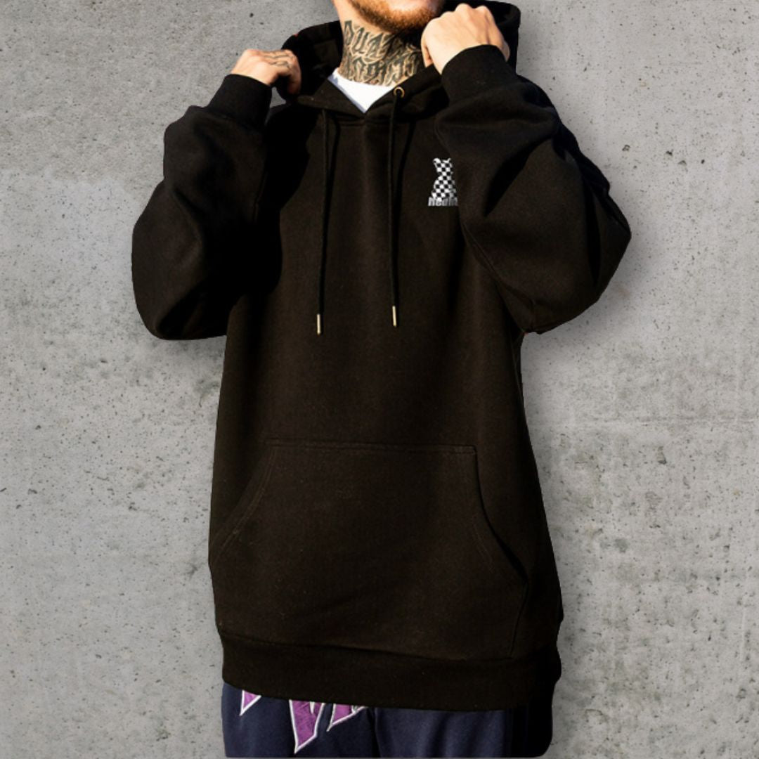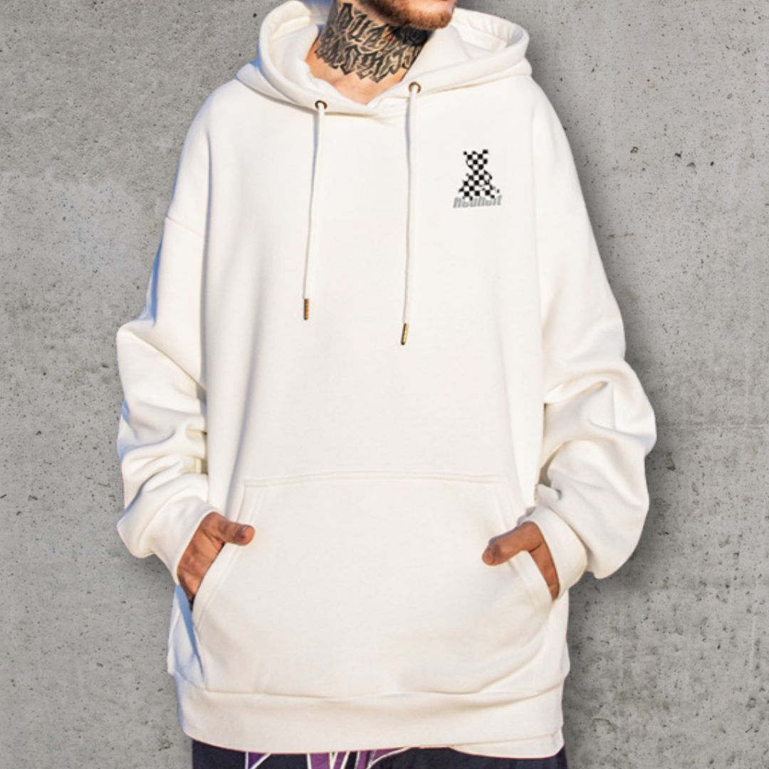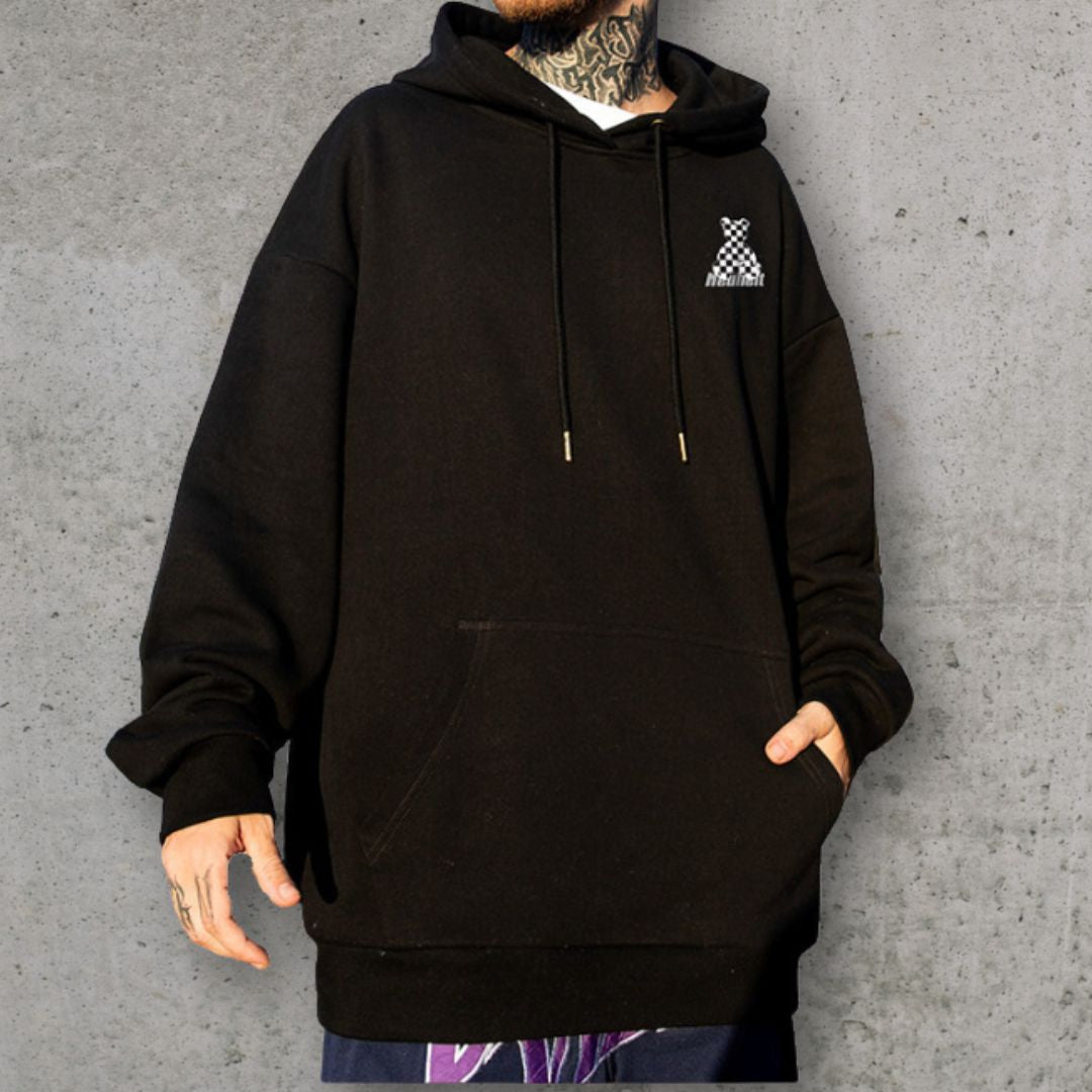 背面にチェッカーパターンのベアモチーフを大胆に配置した、ゆとりのあるシルエットのパーカー。