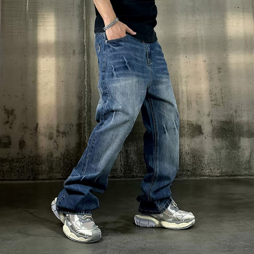 存在感のあるワイドシルエットが際立つ、無骨でクールなデニムパンツ。