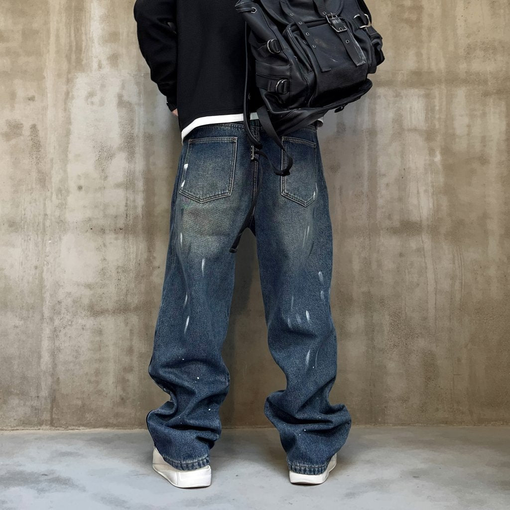 程よく色落ちしたインディゴトーンに、ランダムなペイント加工を施したワイドシルエットのデニムパンツ。